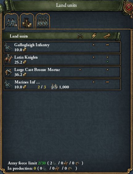 1497/04 拡張アイデアのコンプリートボーナスでアフリカ各州の自治率が下がったため、陸軍扶養限界が30に達してようやく3つ目の連隊を生産可能になった