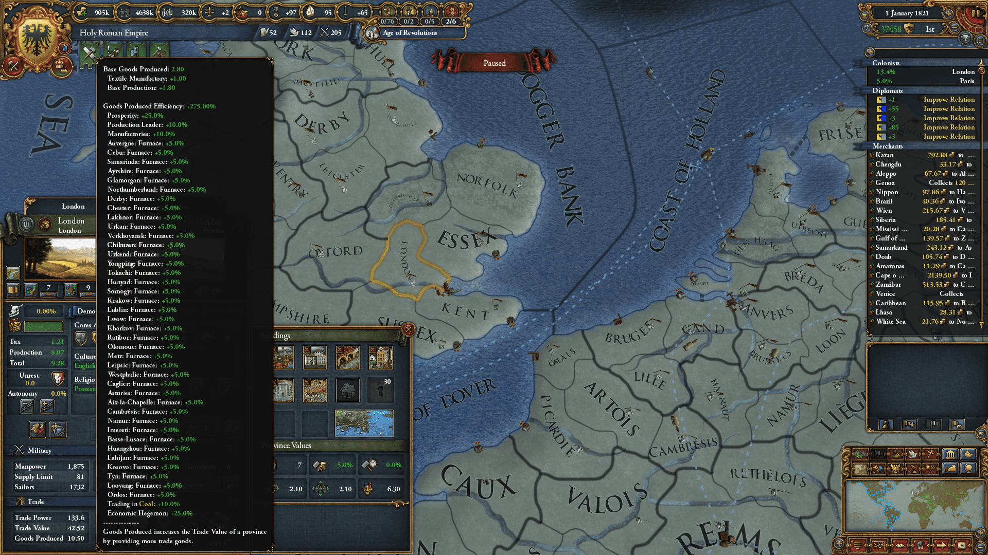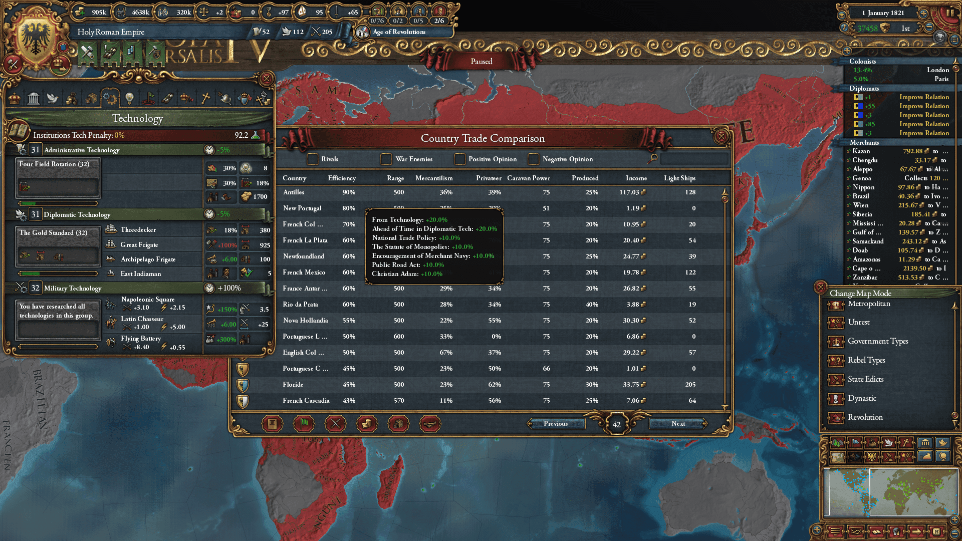 植民地国家との交易効率の比較時に気付いたが、外交技術Lv32だと技術先行ボーナスで交易効率+20%がついたらしい