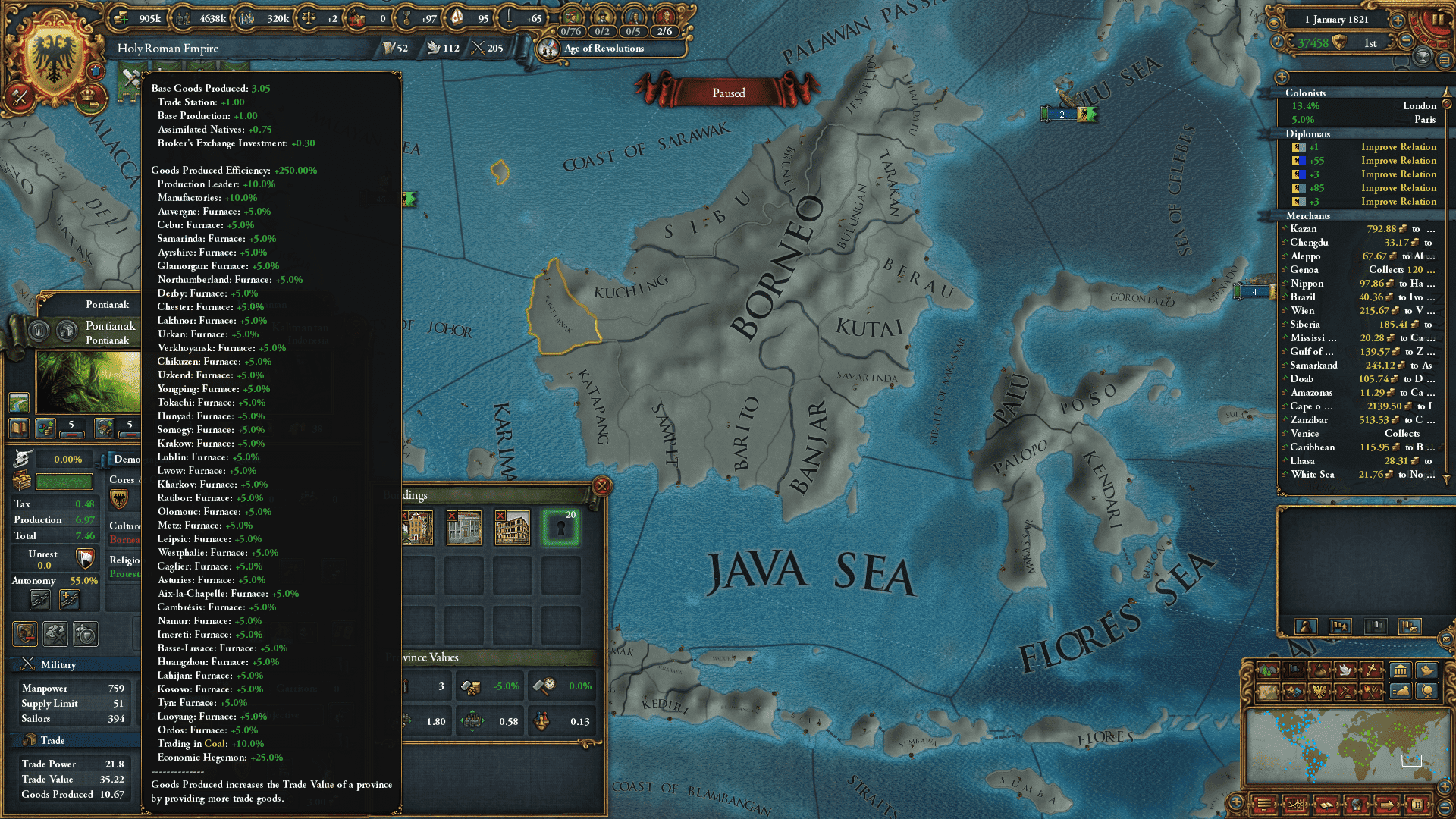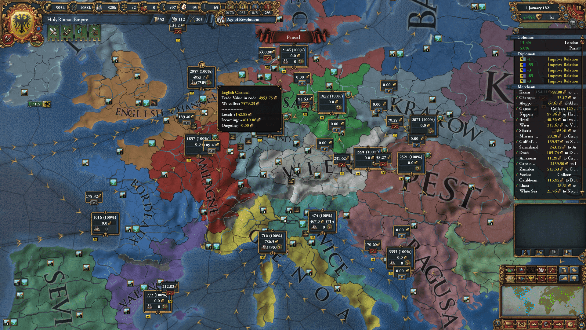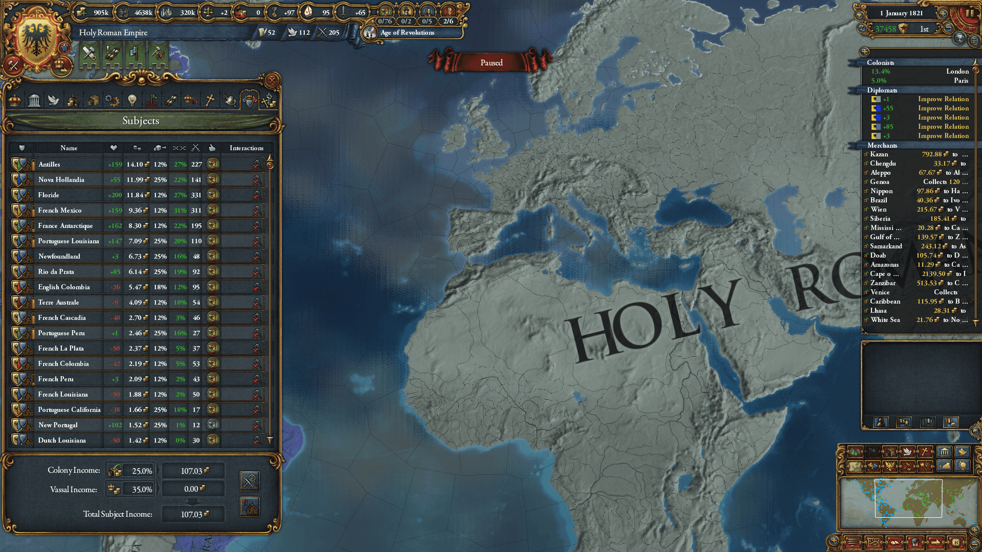 自治率は操作可能な州がなかったので、おそらく全ての州が自治度下限に達したと思う(西欧のステートが0%、貿易会社州が55%)