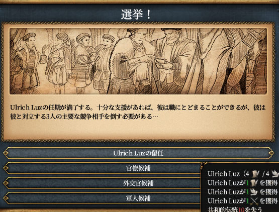 戦争中にまたウルリヒの任期が来ました。一部共和派が彼を失脚させようとするも兵士たちから根強い支持を得ているウルリヒに表立って対抗する者は現れず、反ウルリヒ有力者はアルザスのスパイ疑惑をかけられ粛清されます。もちろん続投。