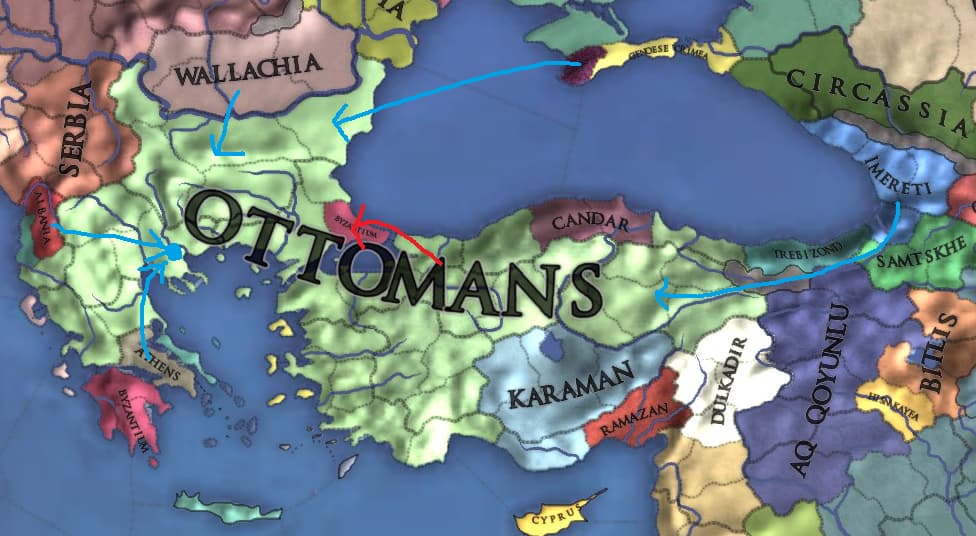 ①強力な同盟国を得てOttomansに宣戦布告し、領土を取り返す。