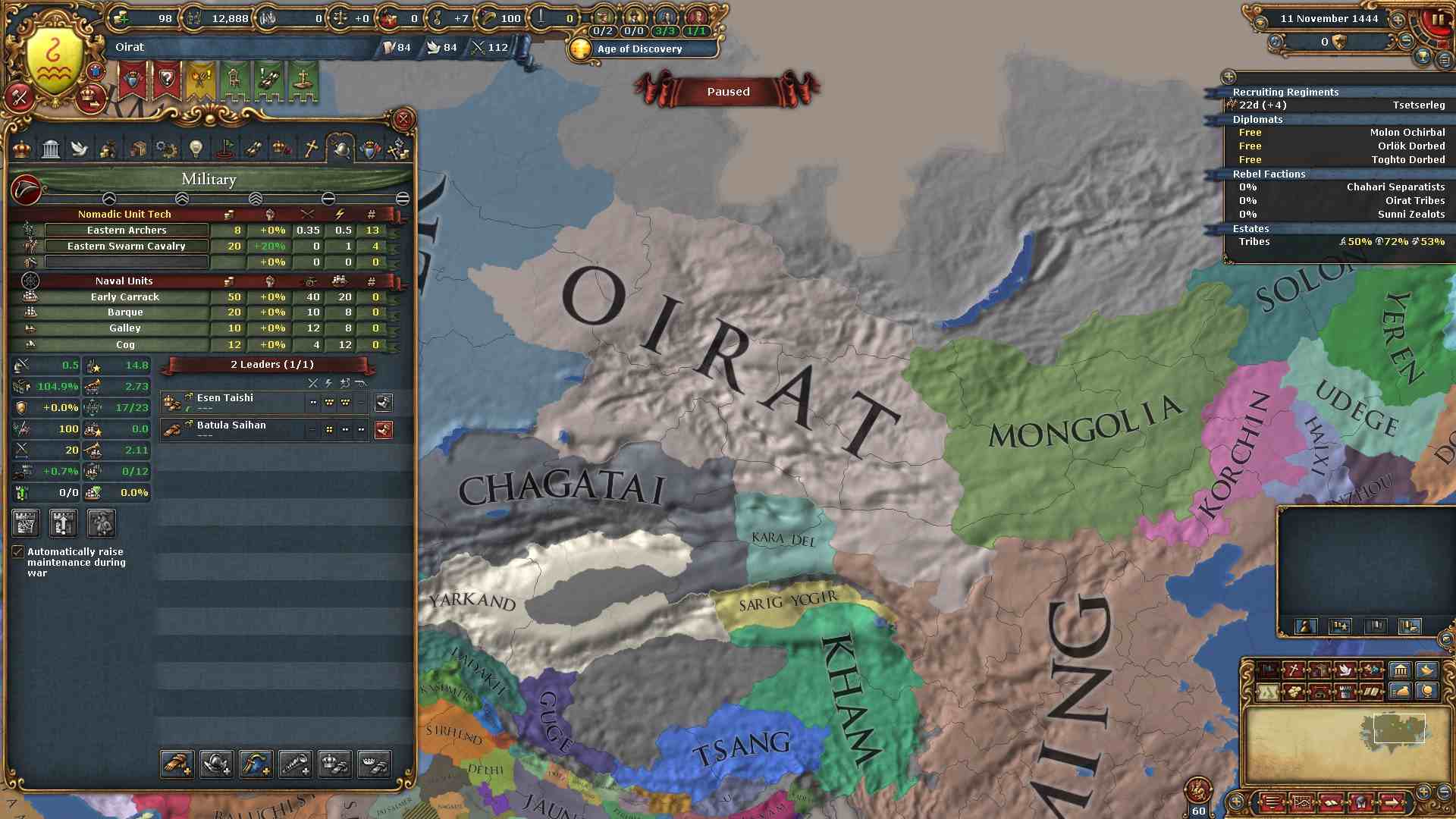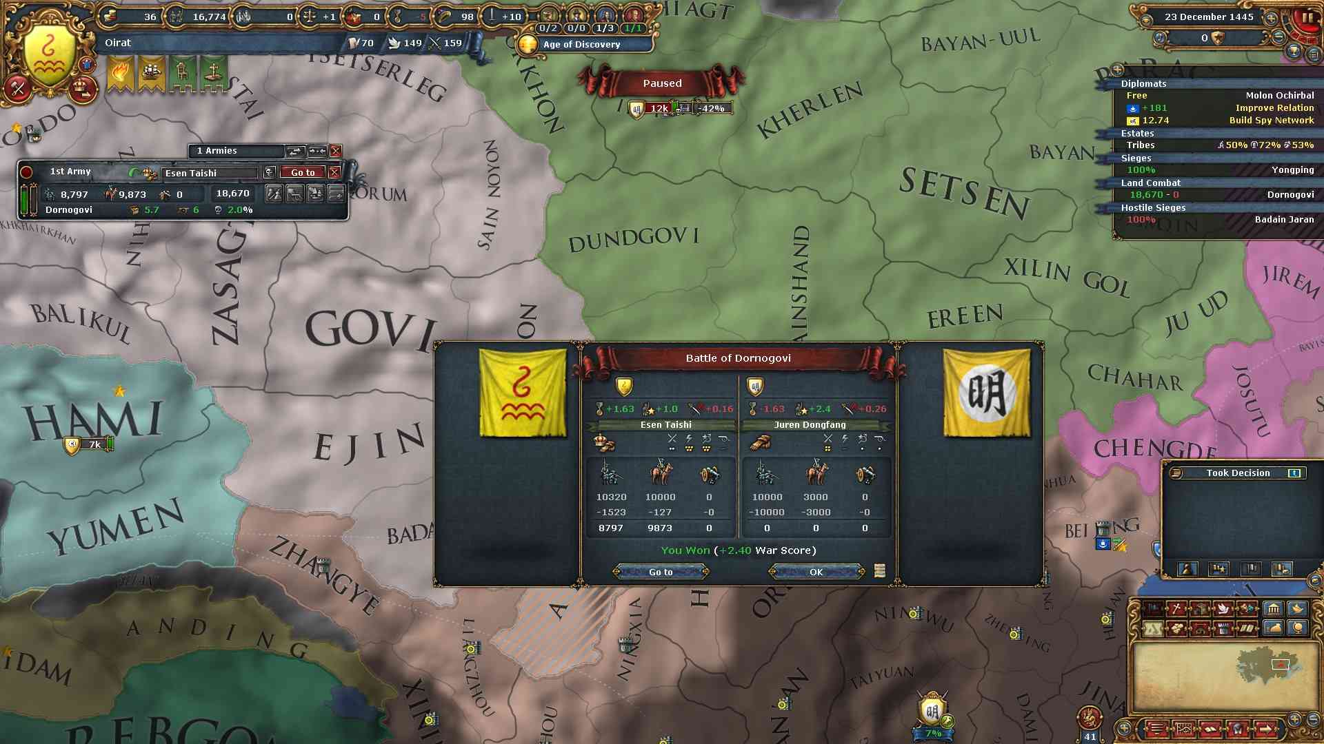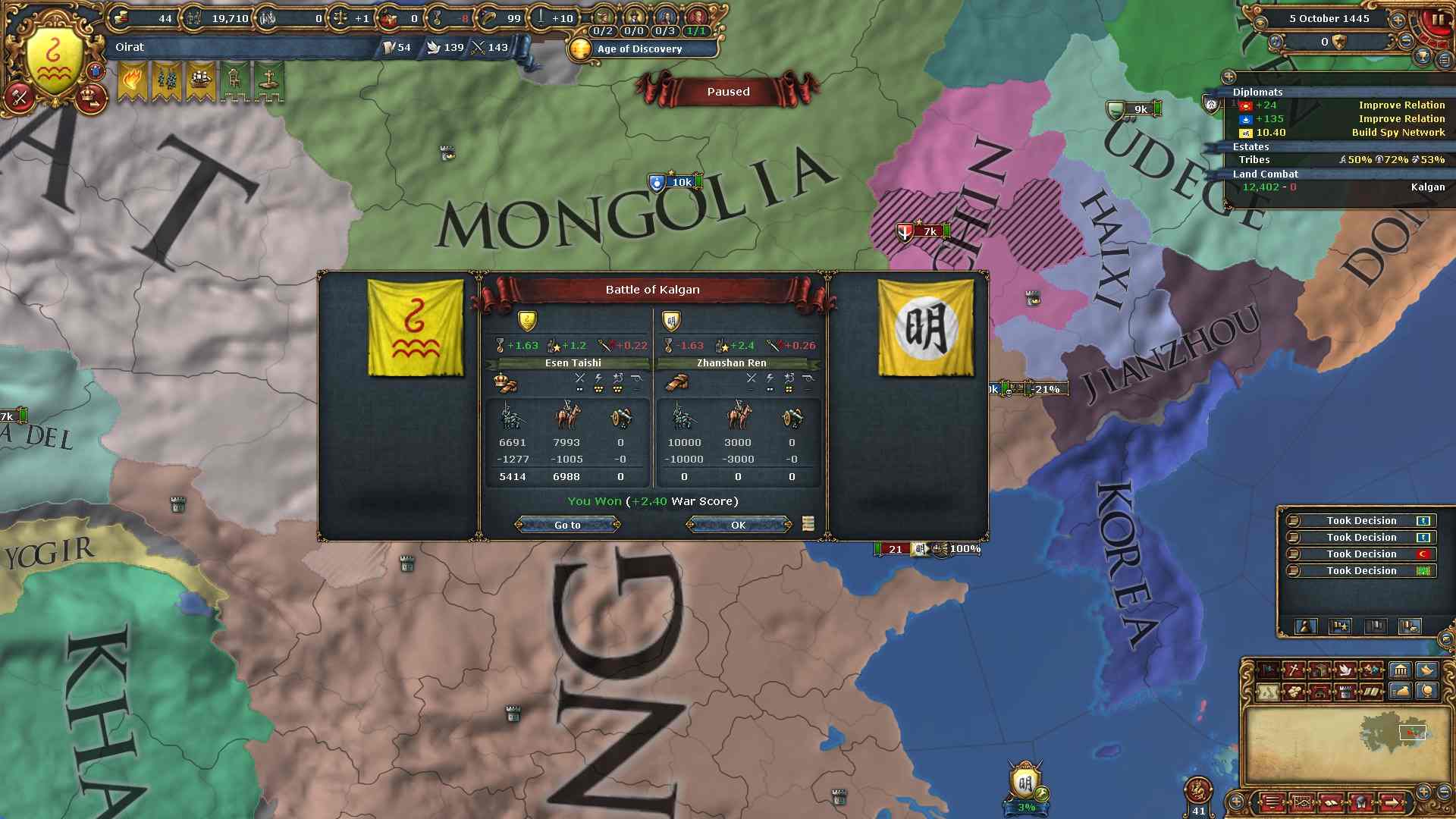 またオイラトの君主エセンが死ぬまでのバフとして士気+20%、攻城能力+25%が得られます。
