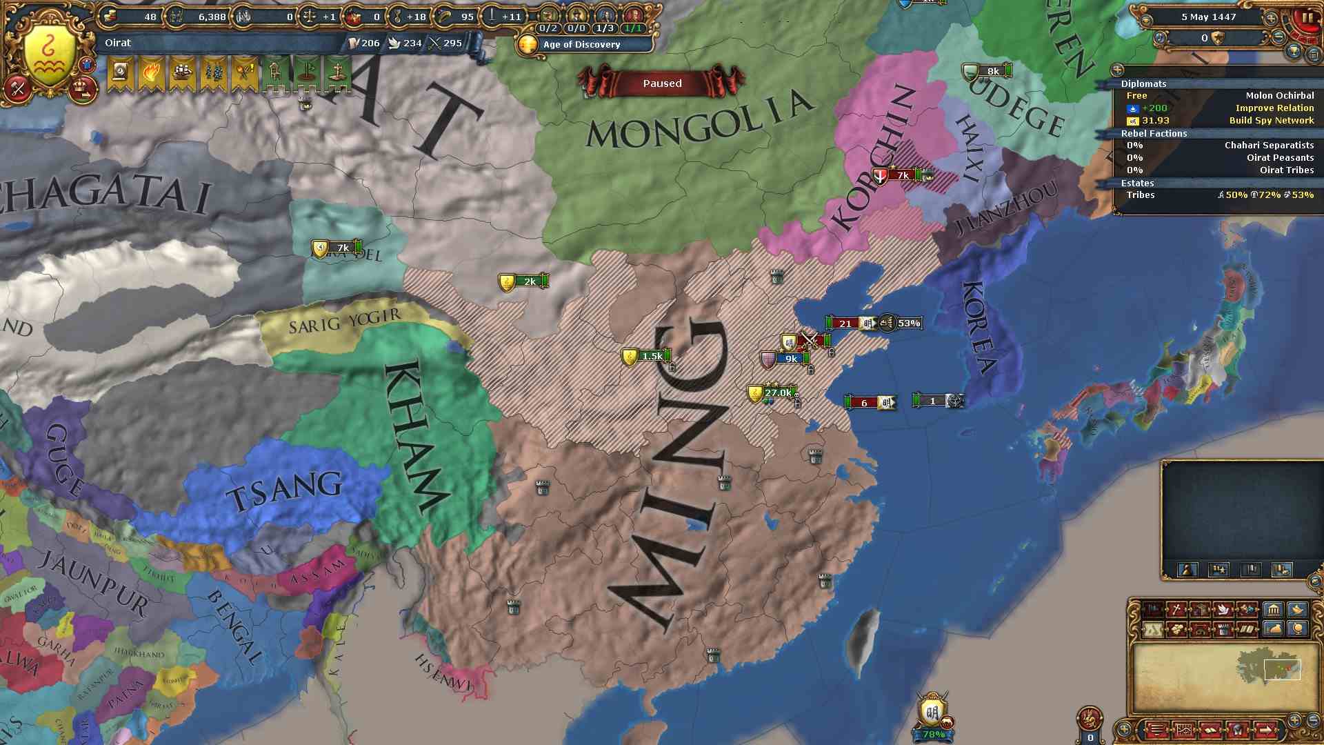 <注釈>北京占領はオイラト軍包囲の状態で行ってください。仮にモンゴル軍包囲の状態ですと「北京陥落」のイベントが起こらないようです。アタッチしたモンゴル軍包囲の状態で始まってしまった場合は一度アタッチを解いてオイラト軍包囲の状態にしてからもう一度アタッチして下さい。
