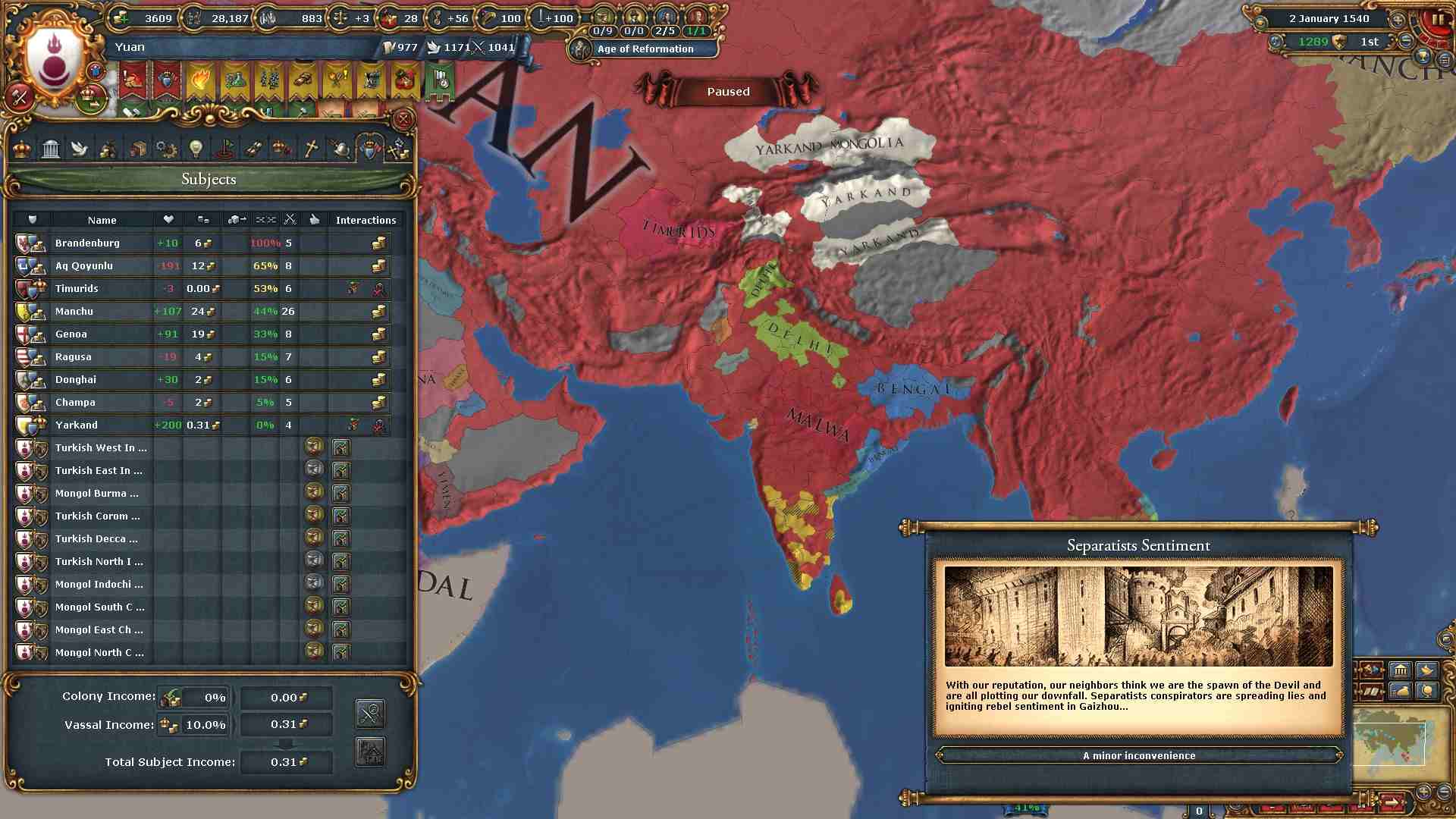同盟:ボヘミア、オーストリア、日本 属国:ティムール、ヤルカンド