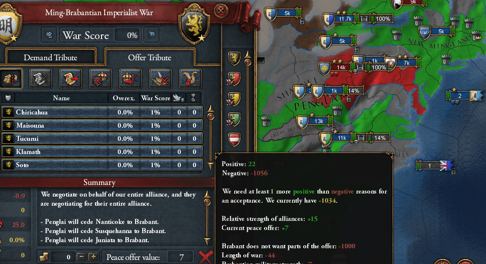 以前のバージョンで存在した「保護国」と同じで、朝貢国を併合するには一旦解放してから征服しなければいけないのです。しかし1回の戦争で潰し切れないような大朝貢国を解放すると天命がゴリゴリ削れてしまうので解放を渋り、その間にその朝貢国は勝手に周辺の朝貢国を併呑してさらに大きくなり・・・という面倒な悪循環に陥ってしまいます。