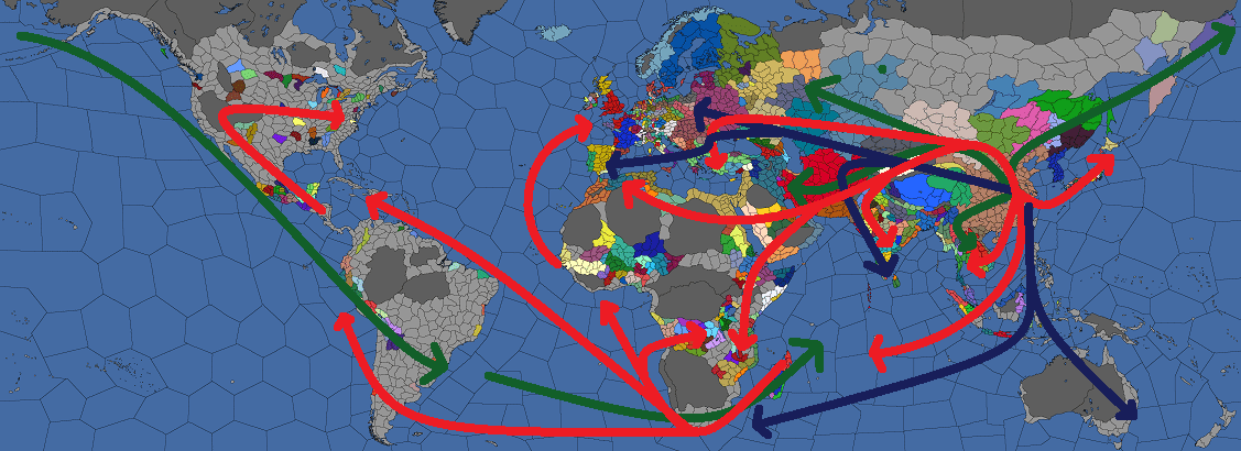赤は1.22で1721年代まで到達しながら結局中断した回じゃったな。最初の三帝冠達成プレイの戦略に立ち戻り、西回りで直接西欧を目指したんじゃ。