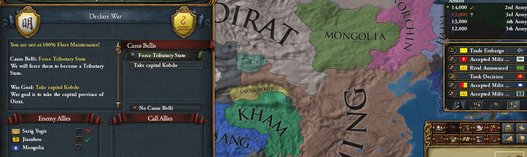 この回では初手でオイラトを攻めたんじゃが、全国から軍を集めて1445年2月に宣戦するころには既に建州や海西と同盟を結ばれとった。海西に同盟を破棄させて攻め込み勝ちはしたものの、1.22ならオイラトは大抵孤立主義であったゆえ攻めやすさが段違いじゃった。