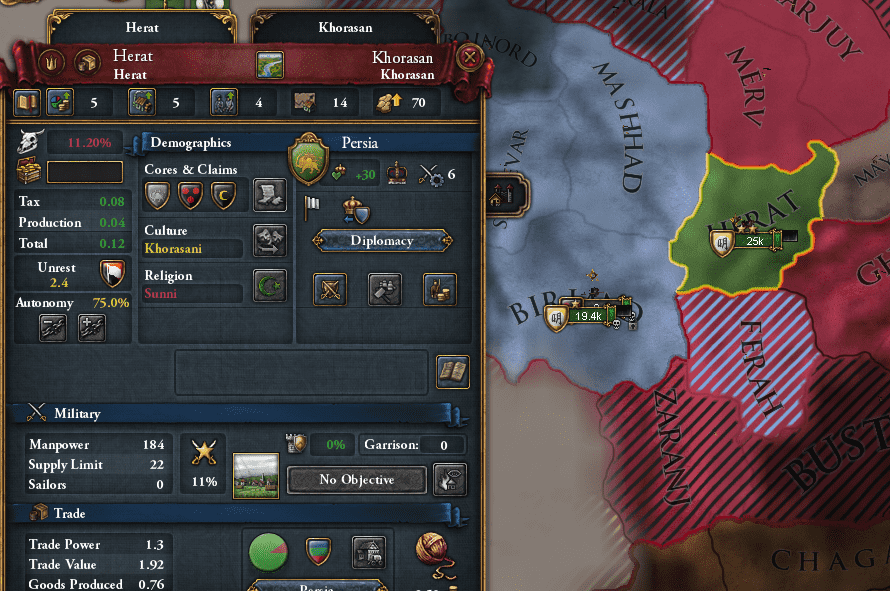 それに反乱勃発時に不穏度が0未満だったプロビには不穏度-100がつかず、少しでも不穏度が上がればすぐに反乱が再発します。それなら征服地は一旦放置して反乱させ、次に反乱リスクが発生した時に自治度を上げて完全に抑え込む、という2段構えが望ましいんですね。
