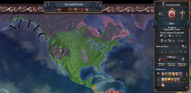 というのも、ネイティブアメリカンは、独自のアイデアや建造物があり、更には政治体制の改革で西○国の90%程度の技術レベルまでジャンプアップする仕様がありますが、メソアメリカのアステカにはそうしたハシゴがなく、簡単に言えば、大きなネイティブアメリカン、たとえばクリークとかイロコイとかに技術Lv・士気・動員兵力ともに普通に負けます。
