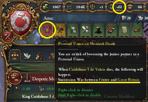危うくイベントで後継者が誕生。継承権が weak だが、同君連合下に置かれるよりはましだ。