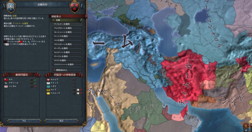 ティムールさんとの同盟を終わらせてペルシア征服に踏み出したぼくたち。味方は長いお付き合いのマムルークさんと、新しい友達ロシアさんです。