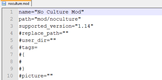 ここでは、MODファイルをどうやって作ればいいかを、練習用の「No Culture Mod」(世界中の文化をすべて消すという何の役にも立たない改変)を使って説明していきます。