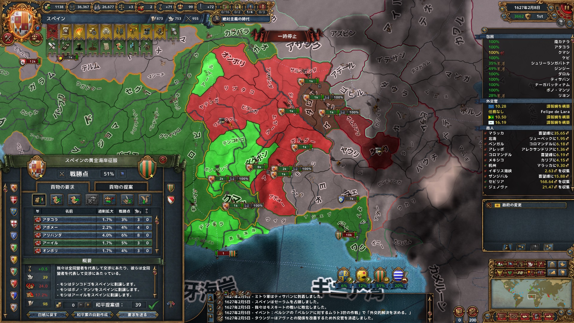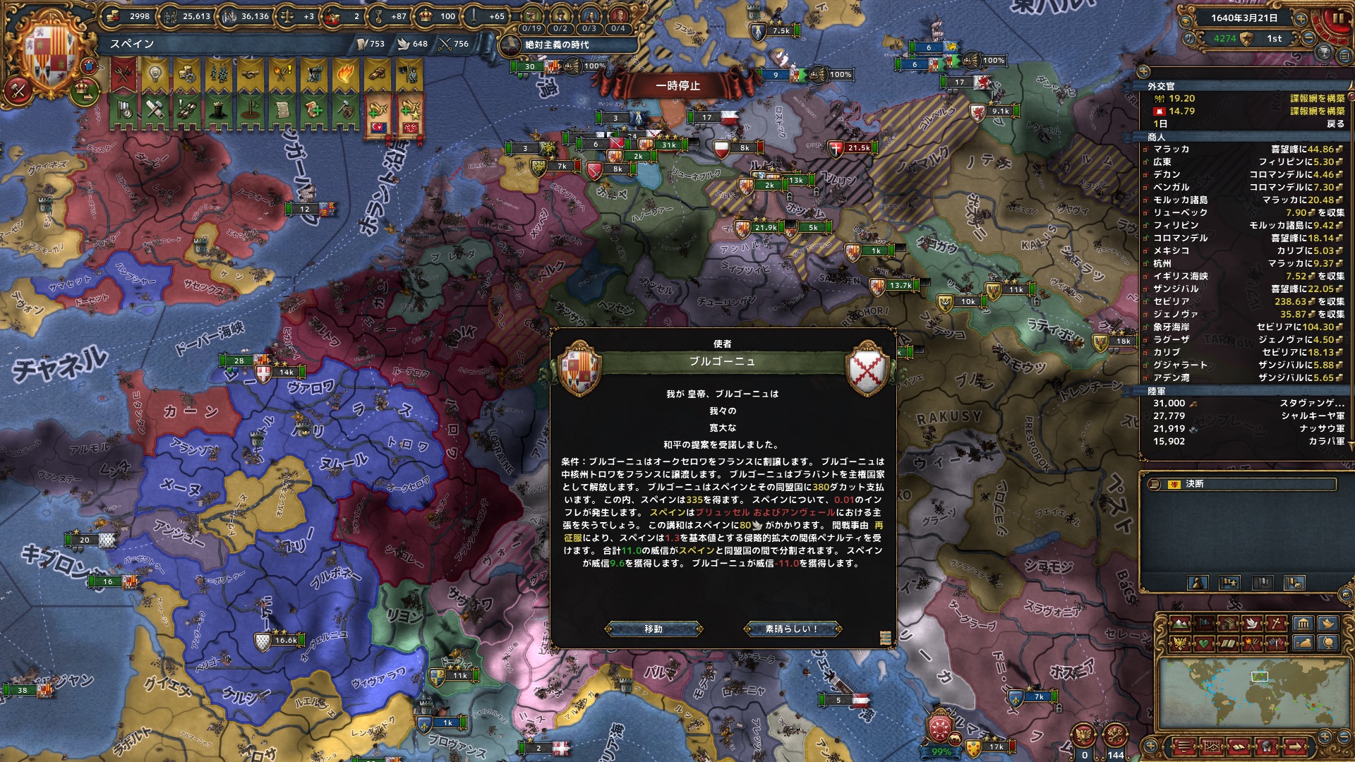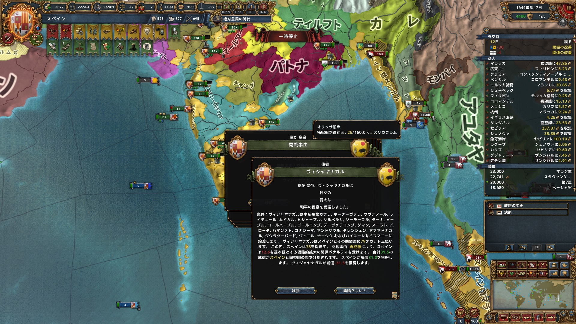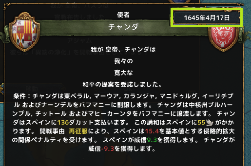 同月、ポルトガルとも停戦。セビリャまでの交易ルートの州をはじめ、海外州を中心に12州を獲得。