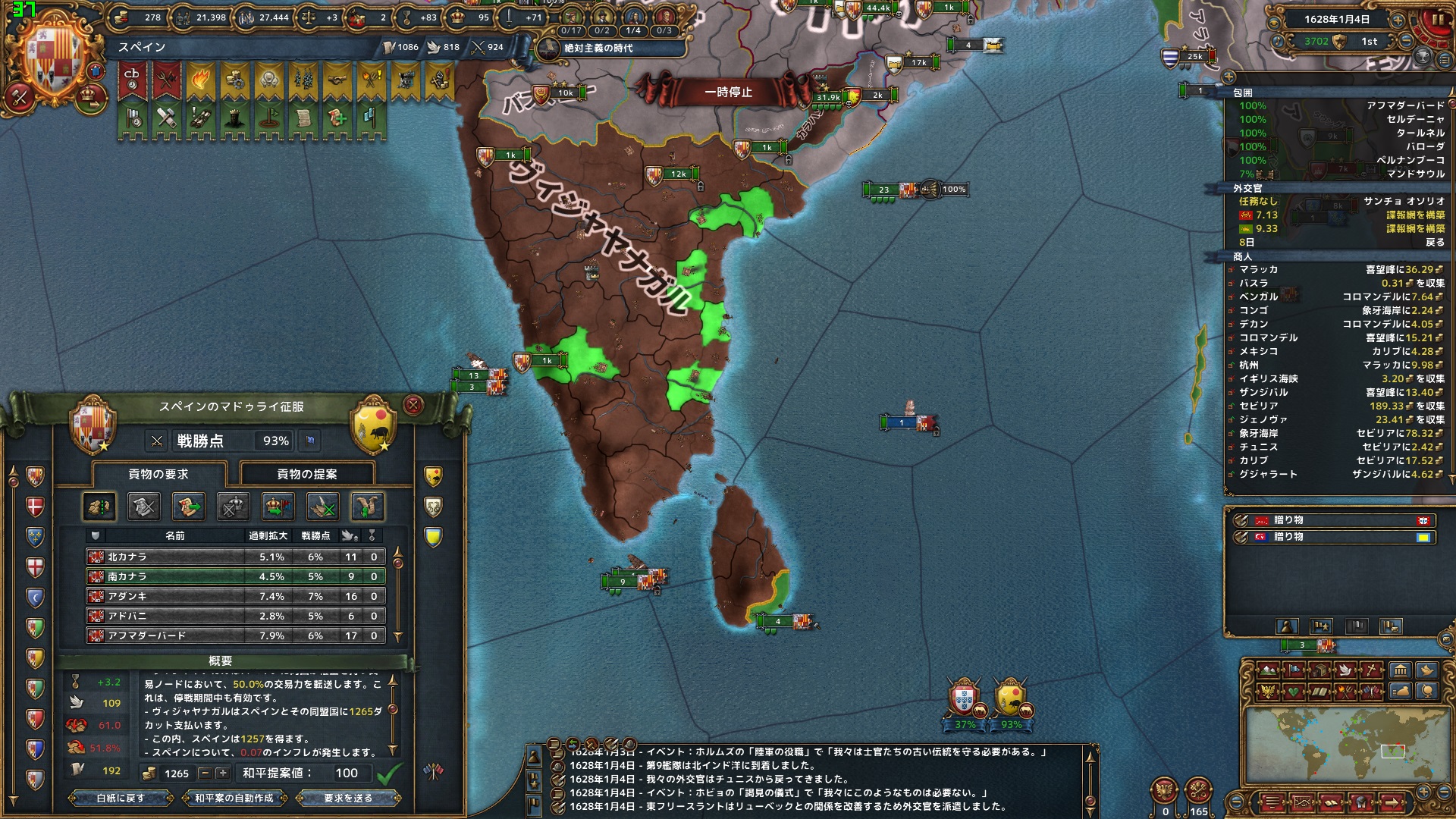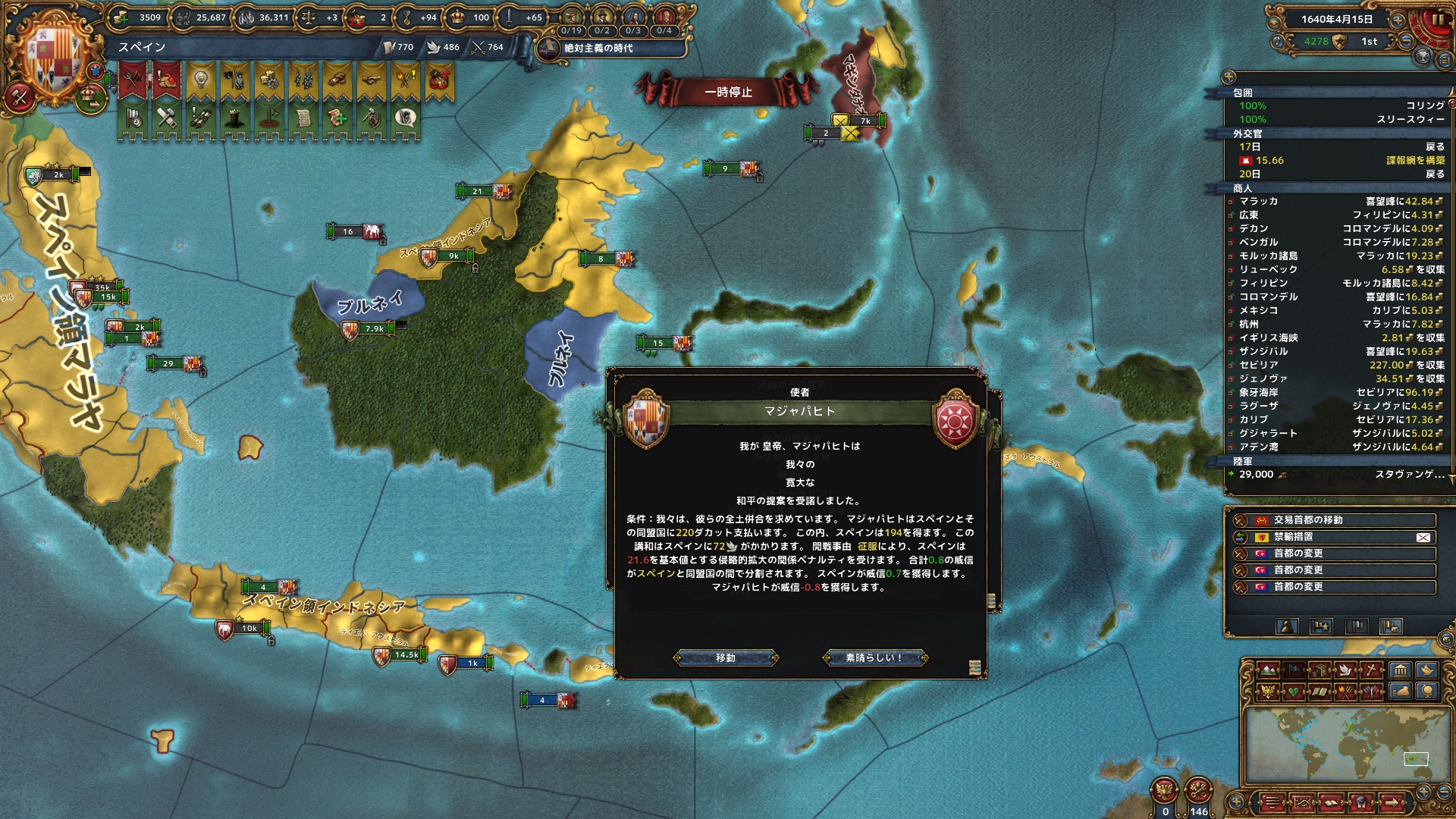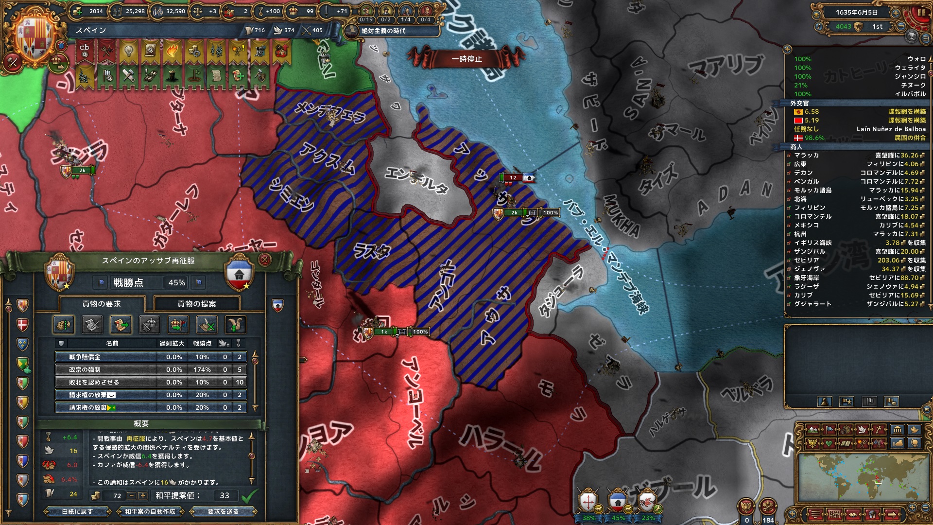 同月、ポルトガルとも停戦。セビリャまでの交易ルートの州をはじめ、海外州を中心に12州を獲得。