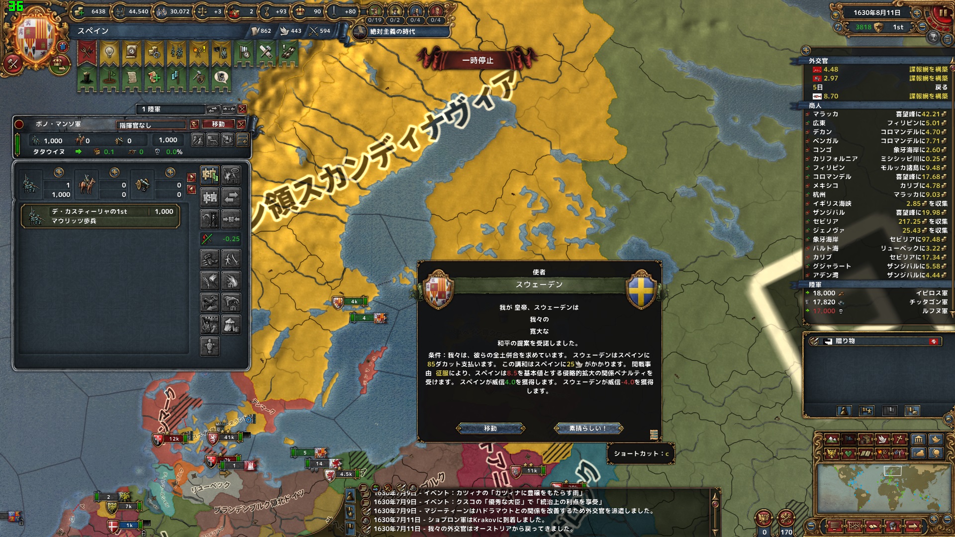 同月、スウェーデンの残り4州を完全併合。スカンディナヴィアの平定が完遂された。