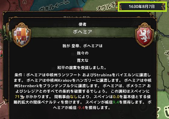 8月 ボヘミアと停戦。周辺国のコアを4州返還させ、同盟を切り崩す。