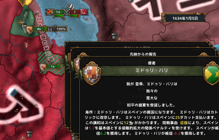 1月 1年あまりかけて首都を陥落し、ミドゥリ・バリを属国化。ついでにカトリックに改宗させておく。