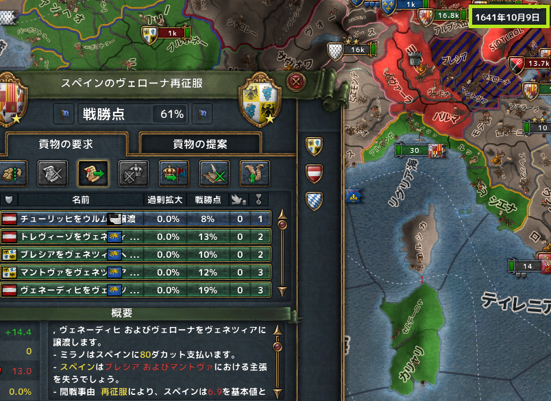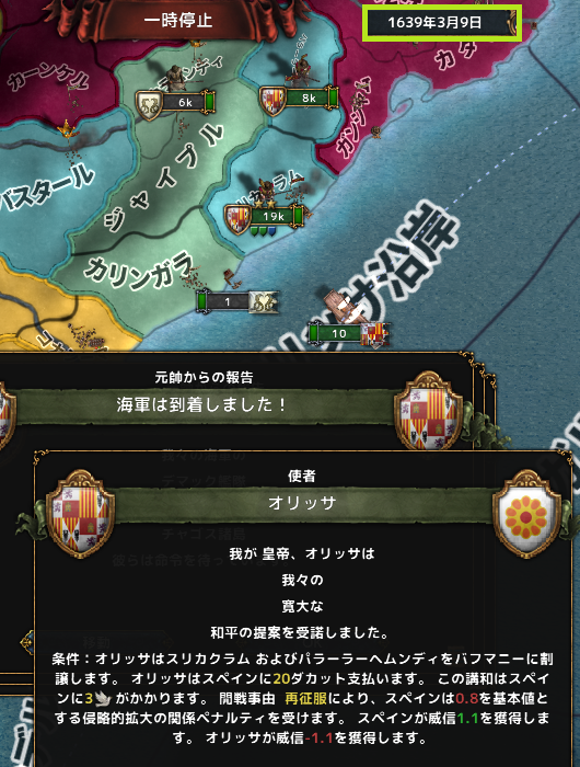 戦勝点99%和平だが、バフマニーのコア州が多すぎてこれだけ取ってもまだ回収しきれない中核州が残った。