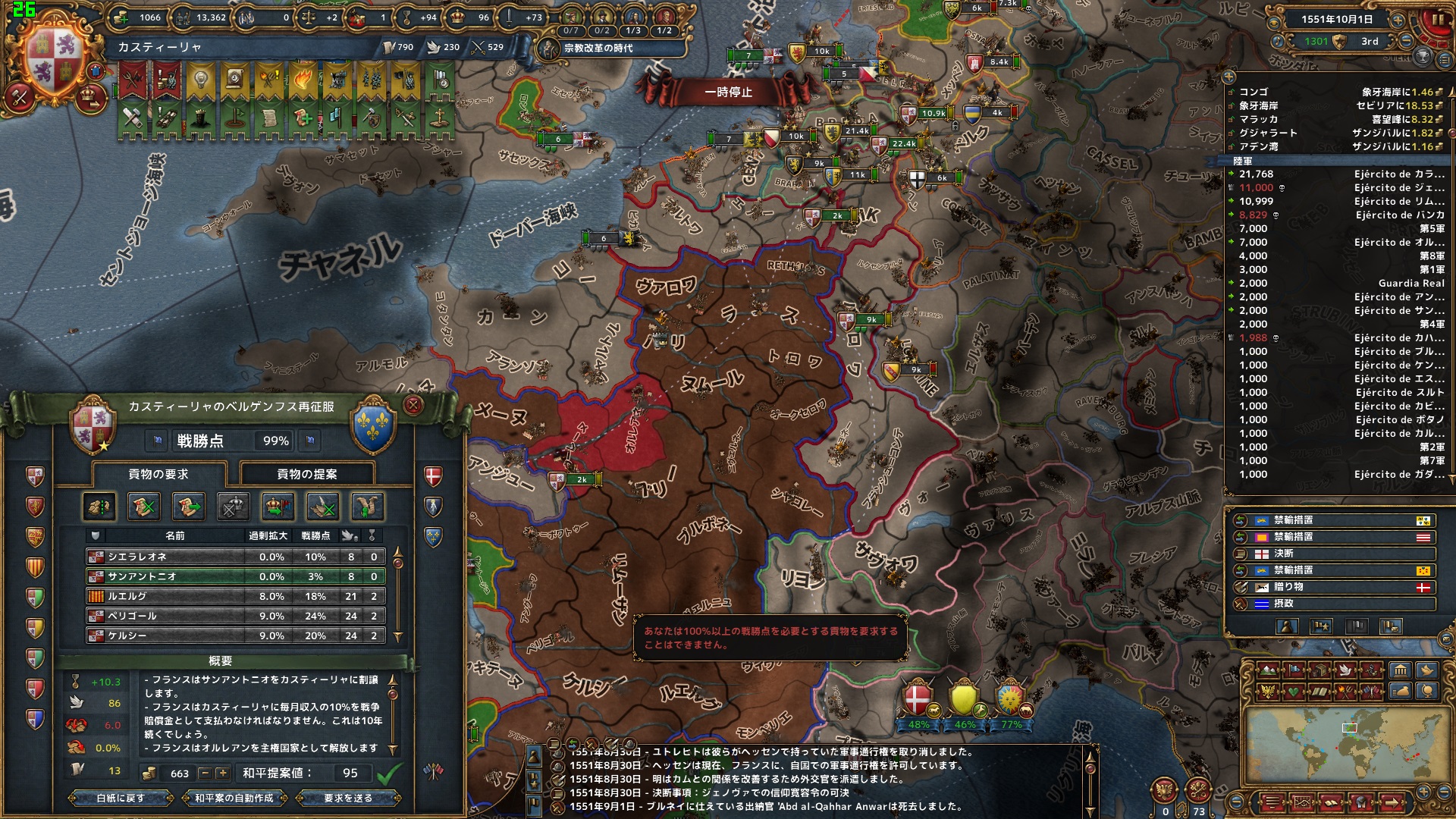 ここに来てできるだけアラゴンを大きくしてからイベント併合したいと考え、この時は小さいAEで多くの州を渡そうとして3プロビを渡している。