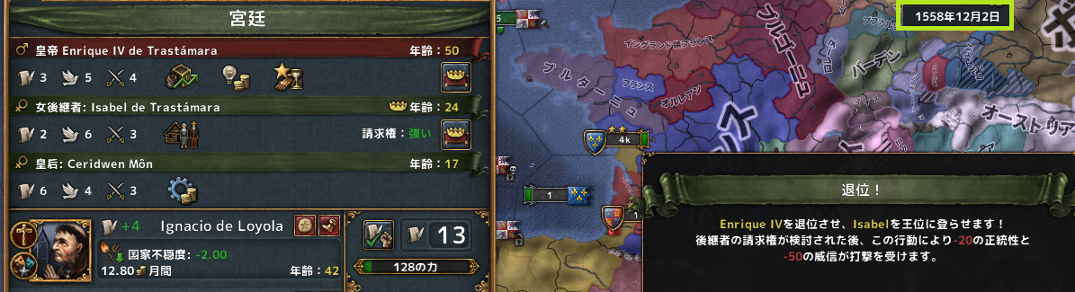 イザベルが跡を継ぎ、イザベルⅡ世を名乗った。君主力も外交の頼もしさが光る(2-6-3)である。