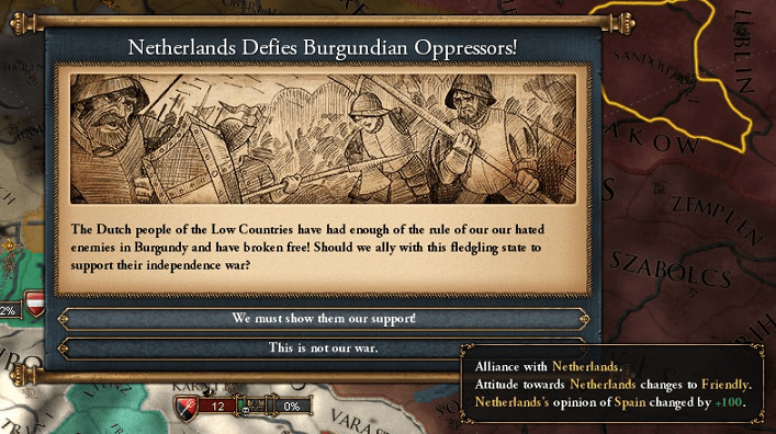 史実ではハプスブルク朝スペインから独立を勝ち取ったオランダが我がスペインに独立支援を求めるのはやや滑稽ではありますが。