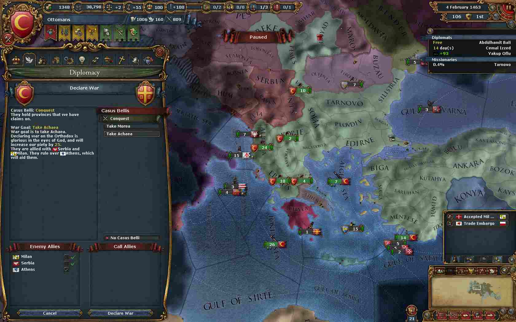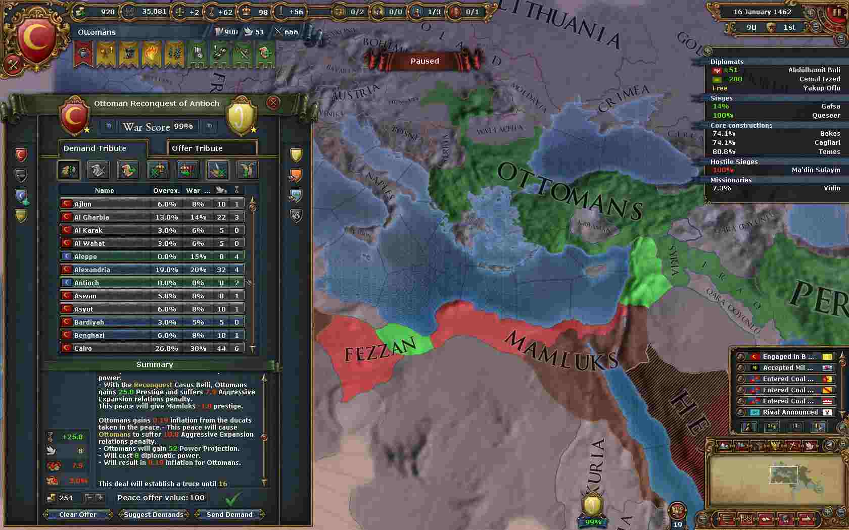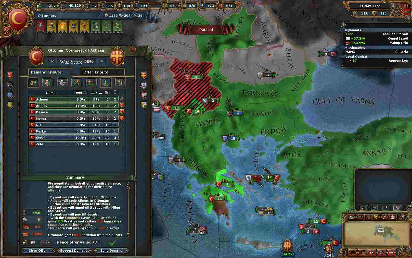 この戦争中にオスマンのコアのあるKaramanを攻め、併合しています。