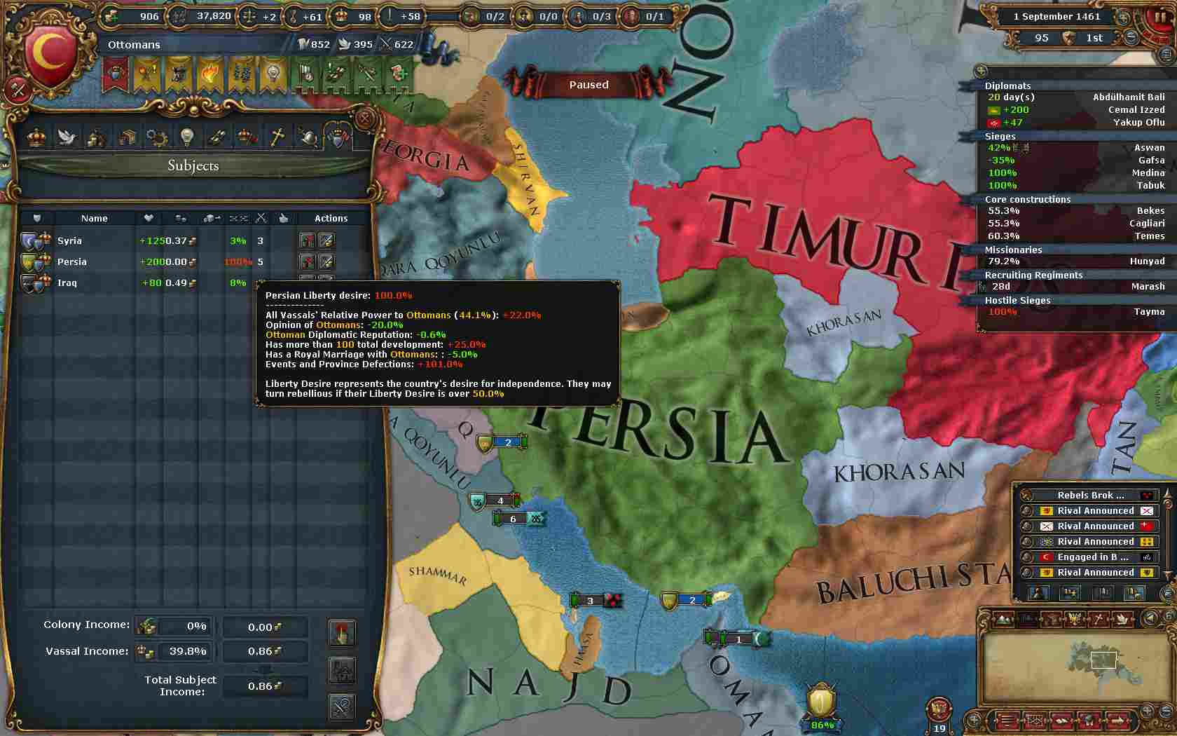 2番目についてはこれまでの属国のコア返還で、AEを上げずに拡大する方法が使えなくなりました。さらに返還時に外交点を消費します。