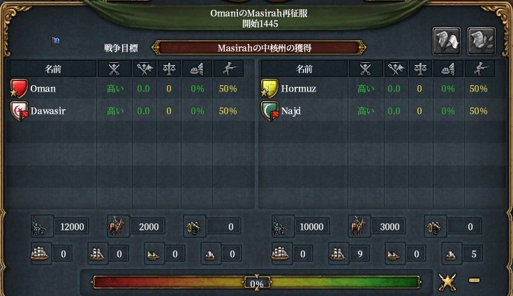 数回のリセマラにより上記条件を満たしたため、君主を将軍化、扶養限界まで歩兵を雇いつつ、同盟国に領地を約束してHormuzに宣戦です。