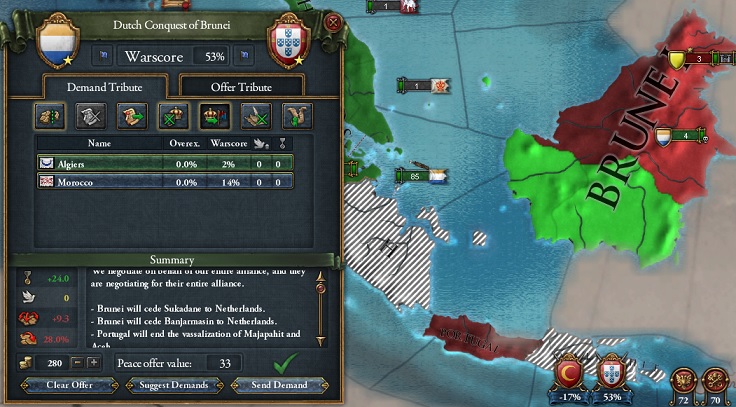 大部分の貴族を犠牲にすることで権力を維持し続けたシャヤカ=ハーンはポルトガルの保護国であるブルネイへの侵攻を開始した。オランダ海軍は既にイギリス海軍を凌ぐほどの艦隊数を保有しており、制海権を確かなものとしたオランダは直ちにボルネオ島全土を占領。ボルネオ島西海岸一帯を割譲させ、東南アジアにおけるポルトガル勢力の排除を強制して和平した。