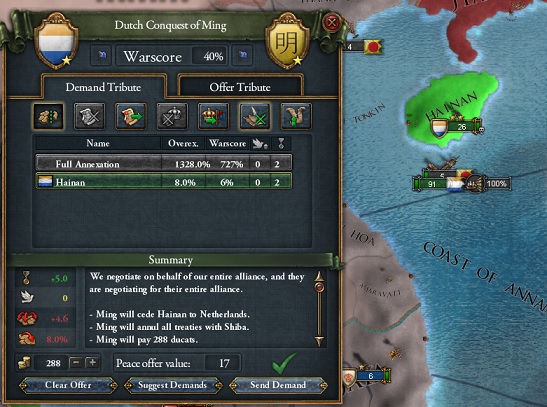 東南アジア貿易の安定を見計らったシャヤカ=ハーンは早くから耳にしていた黄金の国ジパングの征服に本格的に乗り出し始めた。日本征服の拠点として明の有する海南島に目を付けたシャヤカ=ハーンは1676年明に対して宣戦を布告した。これに対して明・日本・斯波氏が連合して迎撃した。しかしオランダの圧倒的な軍事技術の前に連敗を重ね、ついに1678年海南島をオランダに割譲することで和平した。