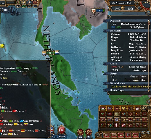 オランダが東南アジアでの勢力圏を急速に拡大していた一方、欧州ではハプスブルク帝国、ロシア帝国がさらに力を増していた。これらに対抗すべく帝国外の西ヨーロッパ諸国は対ハプスブルク、対ロシア帝国を掲げ結束を見せるようになる。これに基づきスペイン、フランスは東南アジアでのオランダの優先権を認め1692年にはスペインと、1694年にはフランスとの同盟再締結にまで至った。