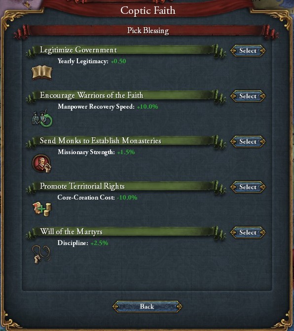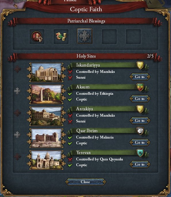 コプトは、コプト国家が5種類の聖地プロヴィンスを保持していると次のようなボーナスを得ることができます。
