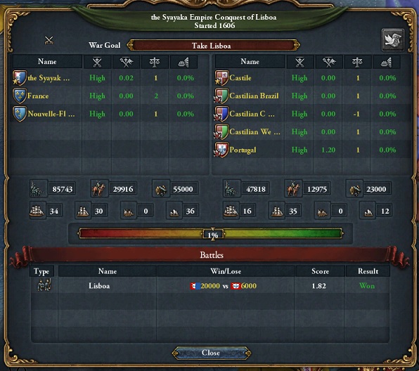 その戦域は大西洋沿岸全域に及んだためこの戦争を差して大西洋戦争と呼ぶ時もある。戦局はその軍事力の差から終始シャヤカ帝国有利に進み戦争はわずか2年半で終結した。この戦争の結果シャヤカ帝国はポルトガルを属国化し、北アメリカ大陸に侵出している欧州勢力の一つを削ぐことに成功した。なおシャヤカ帝国はフランスとの外交関係維持のためフランスが領有権を主張していたカスティーリャの州を譲渡した。