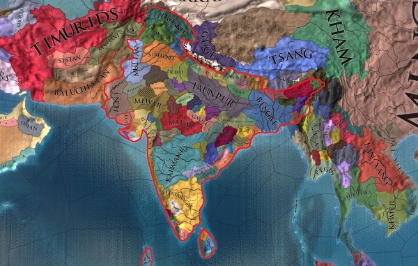ゲーム開始時でのTimuridの属国はTransoxiana、Khorasan、Fars、Afghanistan、Sistanの5つですが、インドに進出するのが容易なのはTransoxianaかAfghanistanです。