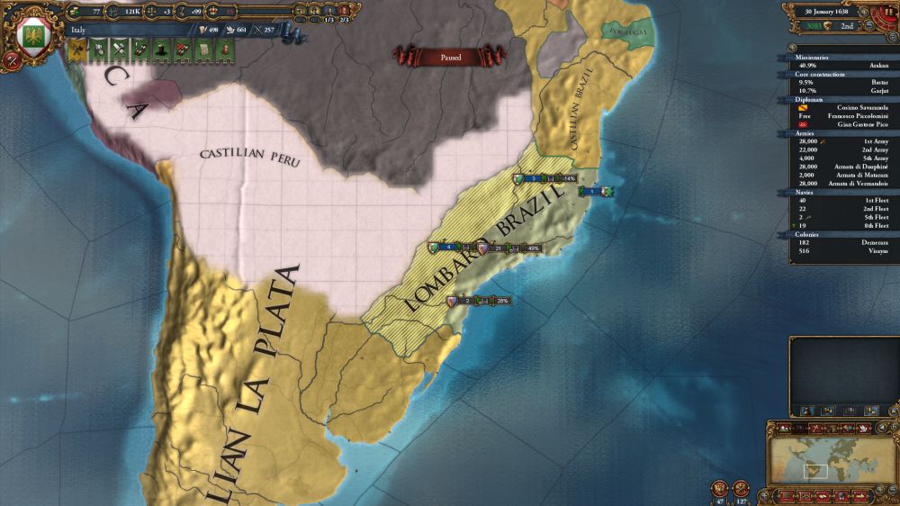 財政をカツカツにしながら建艦と植民を進めていると、またロンバルドブラジルがいじめられているのを見かけます
