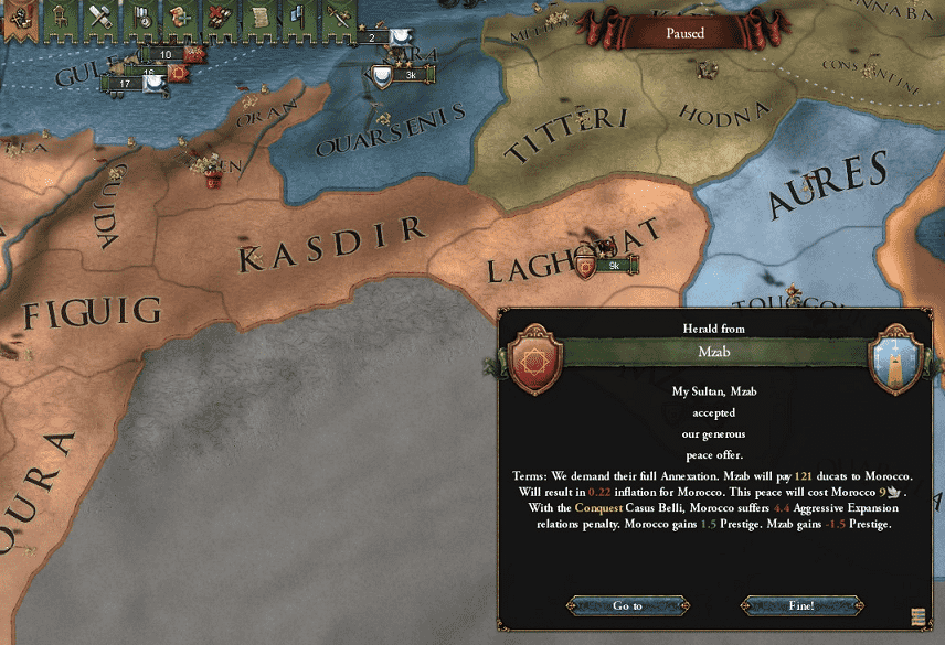そして、あらかじめMzabで構築していたスパイ網を使ってMzabの州Laghouatにclaimを作成し、即宣戦、即併合。