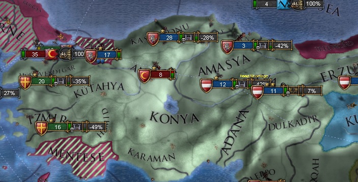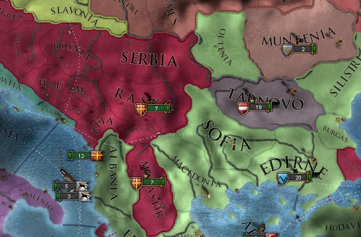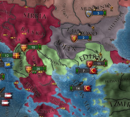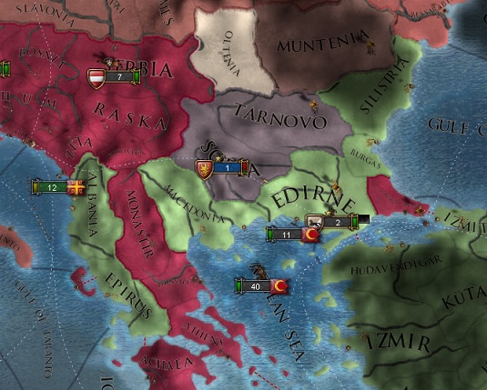 エディルネがオスマンの首都であるためしばらくはエディルネの回収はまだ不可能ですが、ブルガリアを取り込めば首都とも連結できるのであと1戦で自国領全てが連結されると予想します。