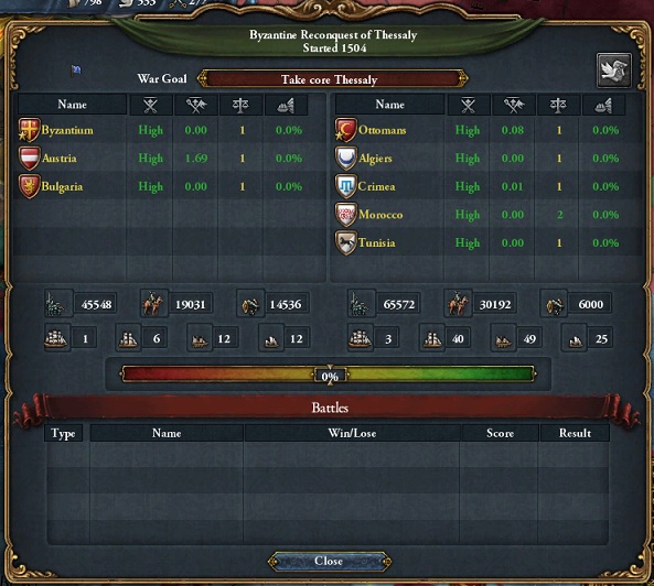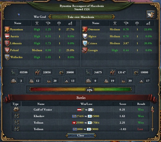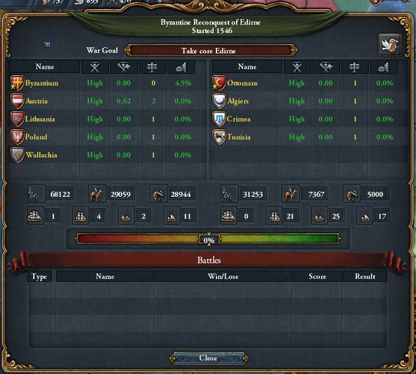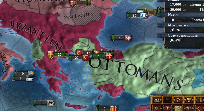 最早東ローマ帝国も安定した国家となってきましたな。オスマン=クリミア同盟がモスクワと交戦中であったこともあり、特記することもなく圧勝しました。アルバニア・エディルネを除くバルカン領すべてのコア返還、小アジアでの拠点としてIzmitの割譲、メンテシェ侯国の独立で和平。アルバニアはオーストリアとオスマンの国境間の距離を保つために残しています。我が国の未回収のコアは残すところアルバニア・エディルネとロードス島のみとなりました。