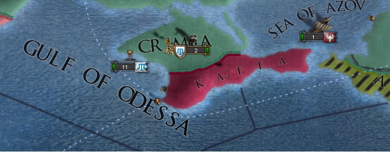いい流れですね。それではBusileusの実績にはクリミア半島の先っちょKaffaの領有が必要ですのでこちらに軍を派遣して占領。先に個別和平で奪っておきましょう。