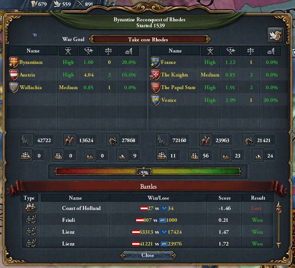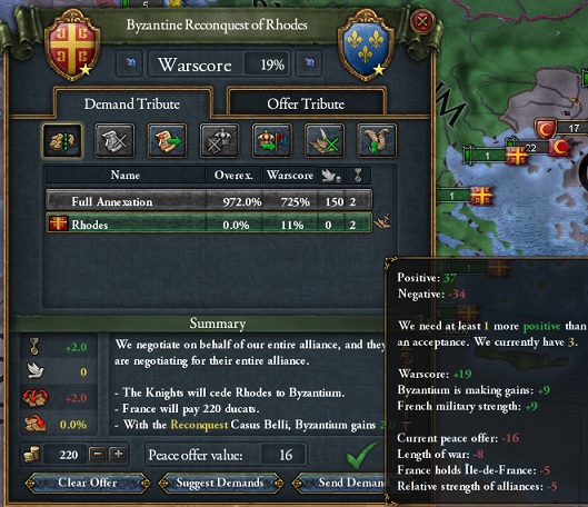 敵側の戦争主導国がロードス騎士団からヴェネツィアに変更。さらにヴェネツィアの同盟国であるフランスが参戦し、フランスが戦争主導国となりました。