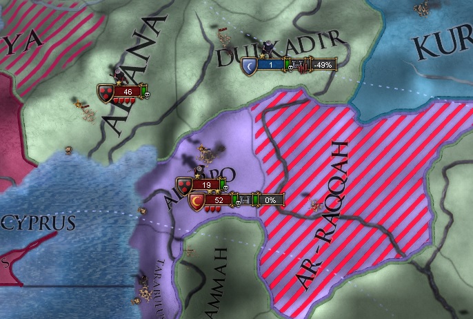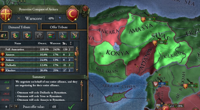 オスマン帝国の首都アンカラを除くアナトリア領すべての割譲とシリアのコア州の返還、エジプトの州を適当に割譲させ和平しました。エジプト方面はマムルークを属国として解放してコア返還で回収していきましょう。