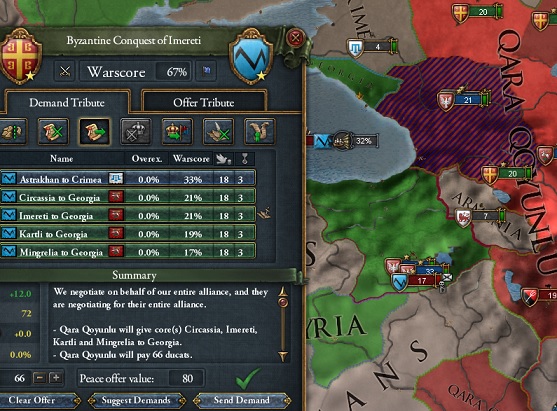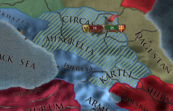 黒羊朝はトリポリと同盟してて総勢40連隊だったよー。でもトリポリ軍はオスマンから通行許可をもらえなかったらしく現れなかったね。難なくほぼ全土を制圧してグルジアのコア州を全て返還させたよ!