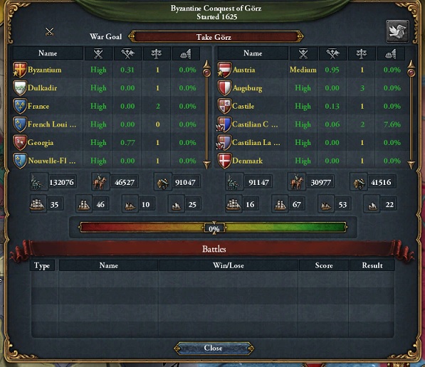 フランス・ポーランド両国が参戦。対するオーストリア側もカスティーリャ・デンマークが参戦。欧州大戦争の火ぶたが切って落とされました。