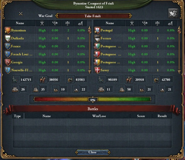 Basileus実績の総本山である対オスマン戦が最早講和内容以外全く説明されないとか泣けてくるねー。それじゃあ40連隊を西部国境に移動させヴェネツィアに宣戦布告だよー。