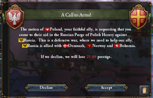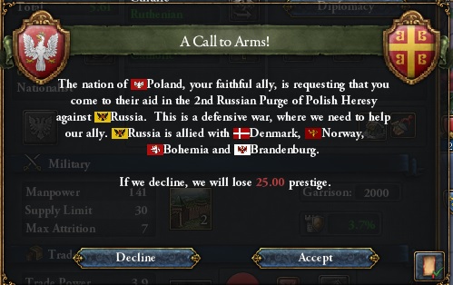 また君かー・・・。今回は国威-25が痛手だけどこの参戦要求は断るよ。ポーランドの交戦国はロシア・ボヘミア・ブランデンブルク・バイエルン・デンマーク・イギリスだよ。これは最早戦争じゃないね。単なる一方的な蹂躙だね。