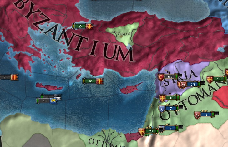 オスマンの首都をアナトリア外に移させて次の対オスマン戦でBasileusを完了させようと思っていましたが、残るアナトリア2州のアンカラに遷都されてしまいました。失策でした、申し訳ございません。