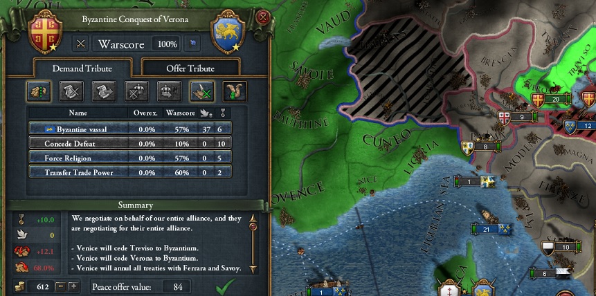 またかー。ほんと嫌がらせとしか思えないタイミングで宣戦して来るね。仕方ないからヴェネツィアからは一州割譲で和平して対ロシア戦に備えるよー。