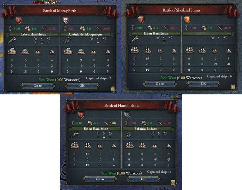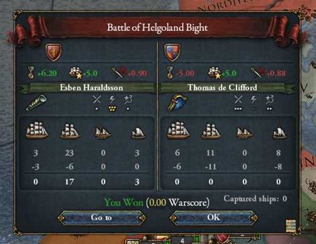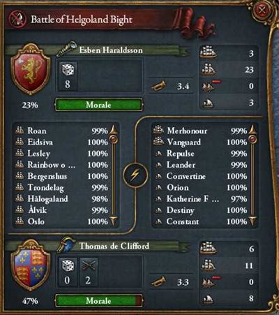 バトル オブ ヘルゴラント イングランドはこの時点で伝統の『海軍士気+20%』と1つ目の固有NIで『重装船戦闘力+10%』を獲得しており既に海なら最強だが、 ノルウェーも伝統の『小型船戦闘力+20%』と2つ目の固有NIで『海軍士気+20%』を解放しており、実はなんと士気は拮抗している。