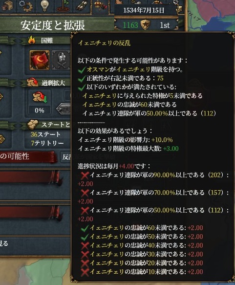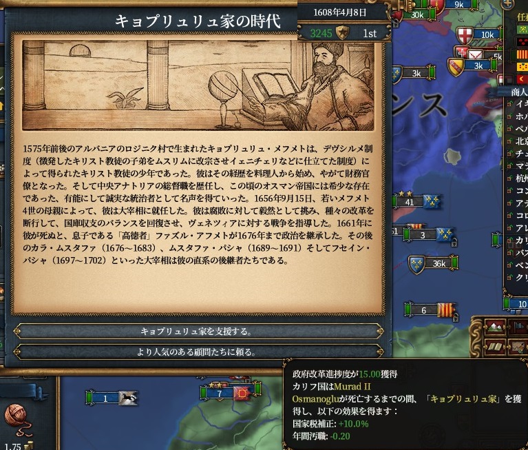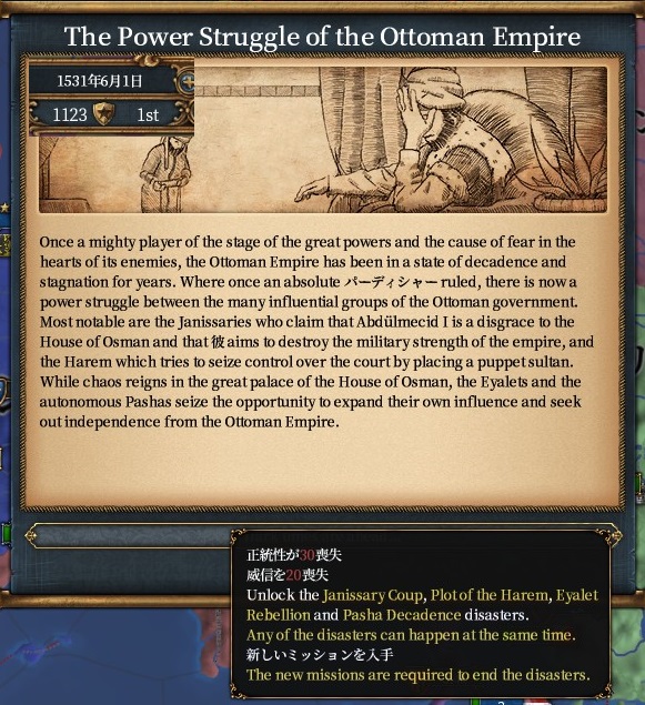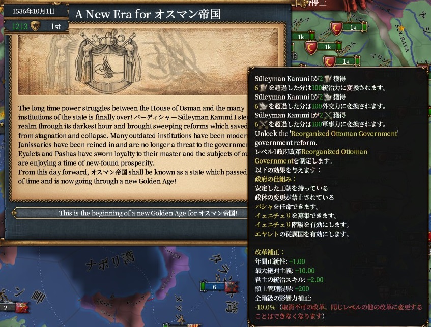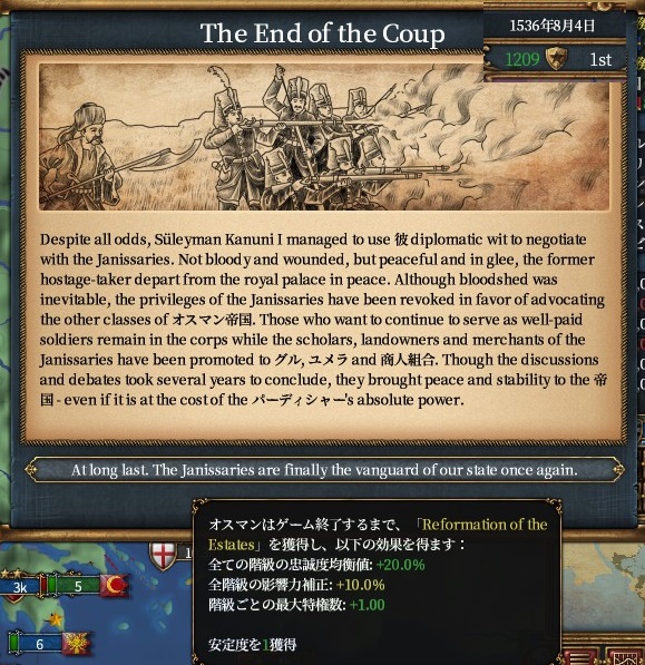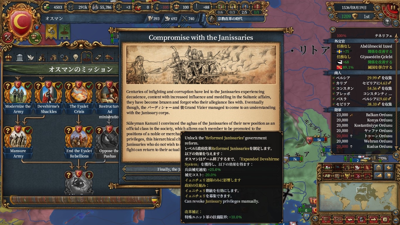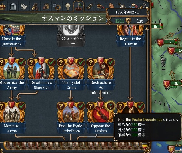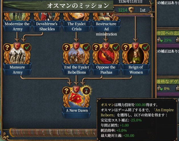 統治効率、安定度コスト減、外交併合コスト減、コアエヤレト化+20、イェニチェリ国難達成による全階級忠誠均衡+20%と影響+10%あるいは絶対主義+15も貰えます。