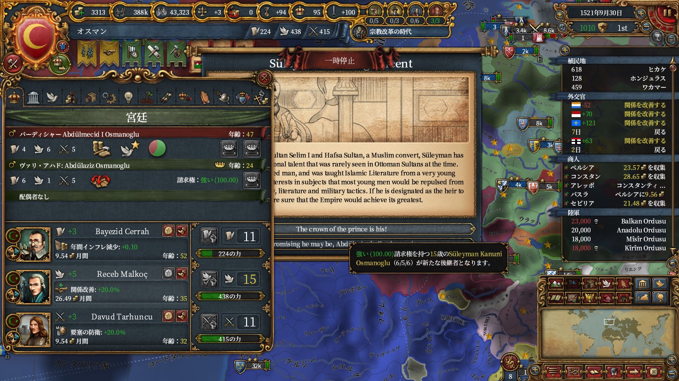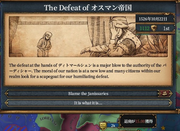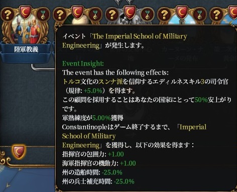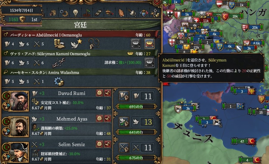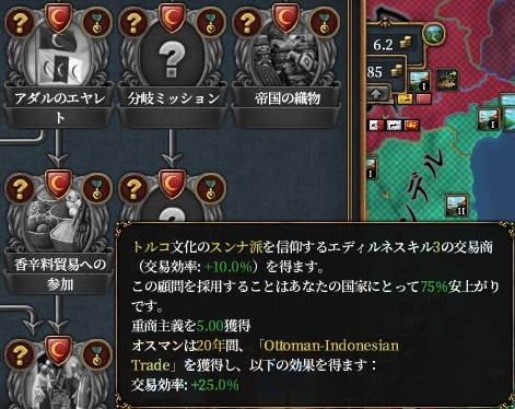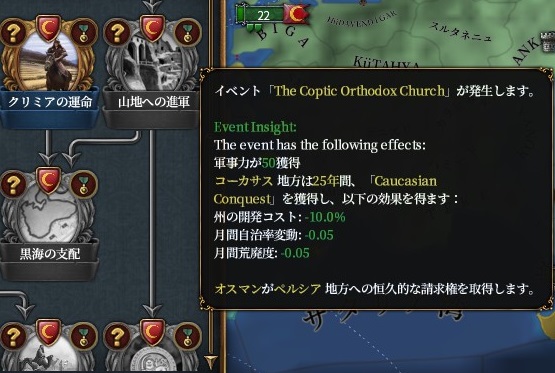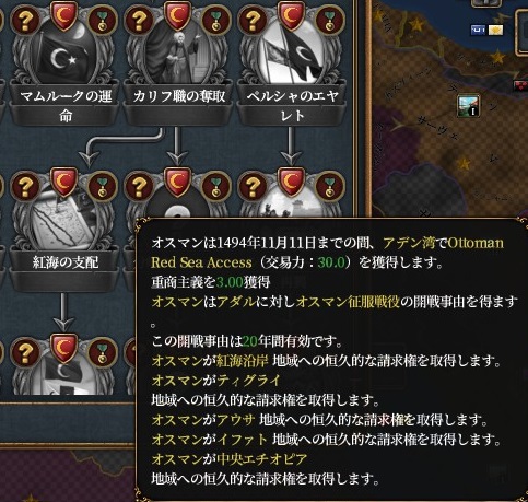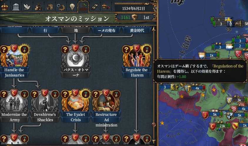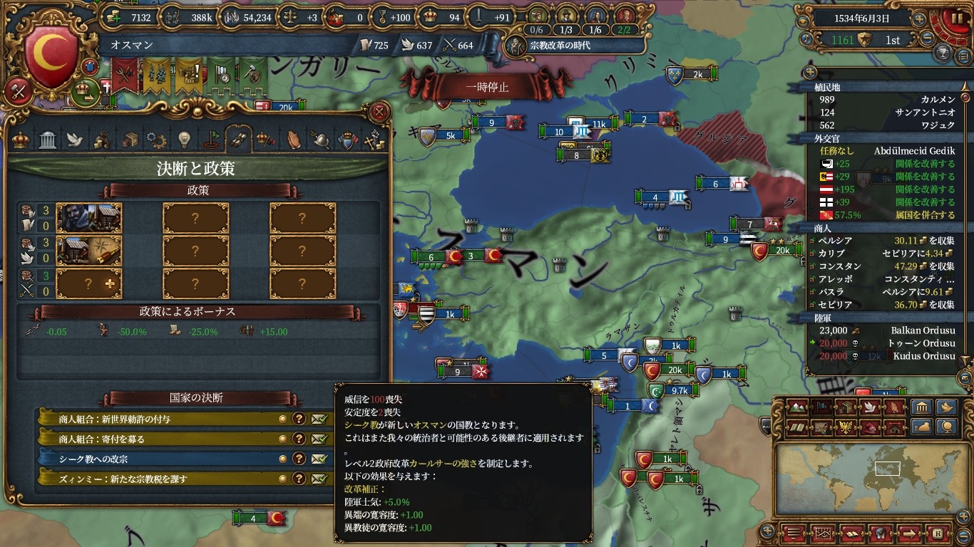 統治効率、安定度コスト減、外交併合コスト減、コアエヤレト化+20、イェニチェリ国難達成による全階級忠誠均衡+20%と影響+10%あるいは絶対主義+15も貰えます。